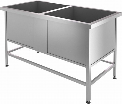 Изделие изготовлено из пищевой н/ж стали AISI 304, каркас из н/ж стали AISI 430.Регулируемые по высоте опоры всех 4-х ножек. Фронтальная часть, на глубину мойки, закрыта фартуком из нержавеющего листа. Материал ванн – нержавеющая сталь, толщина 1,0 мм. Каркас ванн - нержавеющая труба 40х40, 30х30 мм. Объемный борт (высота 50 мм).