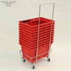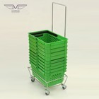 Почему необходимо покупать подставку на колесах для корзинок? Покупатель охотнее возтмет корзинку с подставки, чем с пола. И так же скорее всего поставит на подставку возле кассы, после того как товары выставлены на кассовый бокс. Максимальная высота складирования корзинок рекомендуется не превышать 1 метр во избежание опрокидывания и порчи корзинок. Подставка с ручкой на колесах, удобно перемещать корзинки по торговому залу, при перемещении корзинок от кассы на вход магазина, например при влажной уборке магазина или супермаркета.