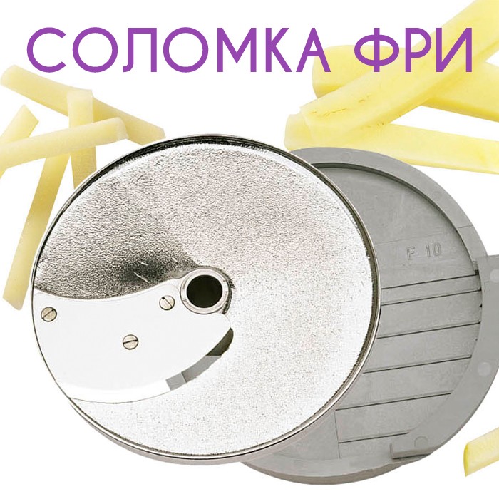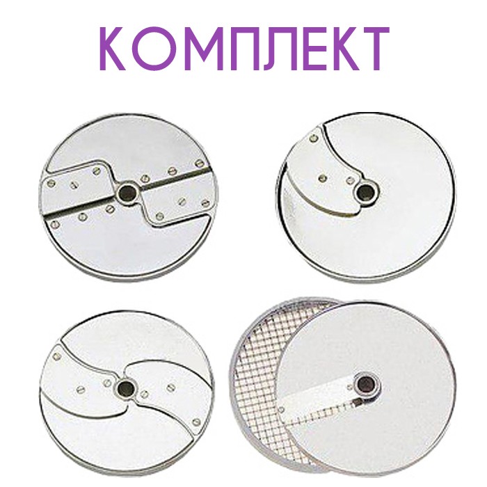 Набір з 8 дисків Robot Coupe 1 933   Комплектація: 2 диска-слайсера 2 мм і 5 мм Диск-терка 2 мм Диск-соломка 3х3 мм Комплект для картоплі фрі 10х10х10 мм з решітки і диска-слайсера Комплект для кубиків 10х10х10 мм з решітки і диска-слайсера