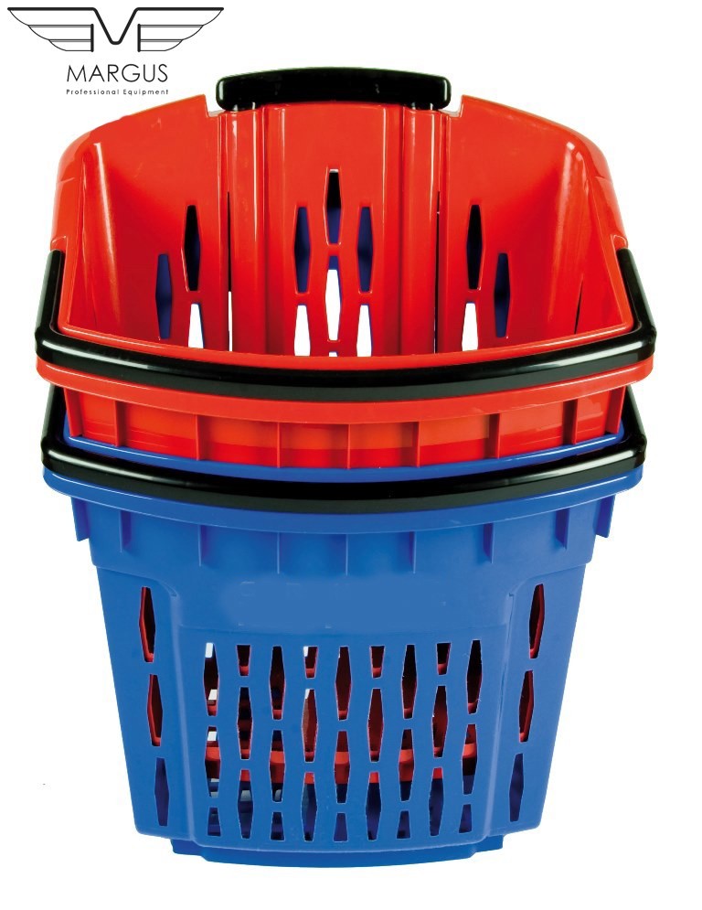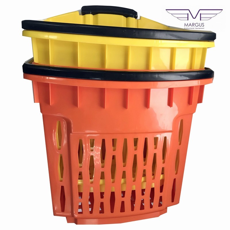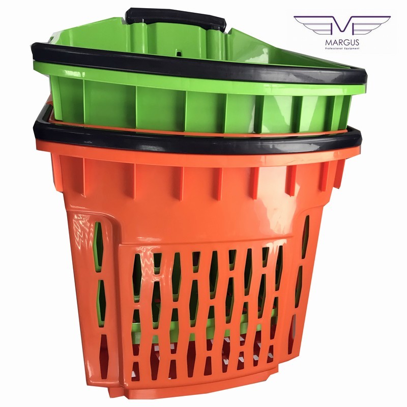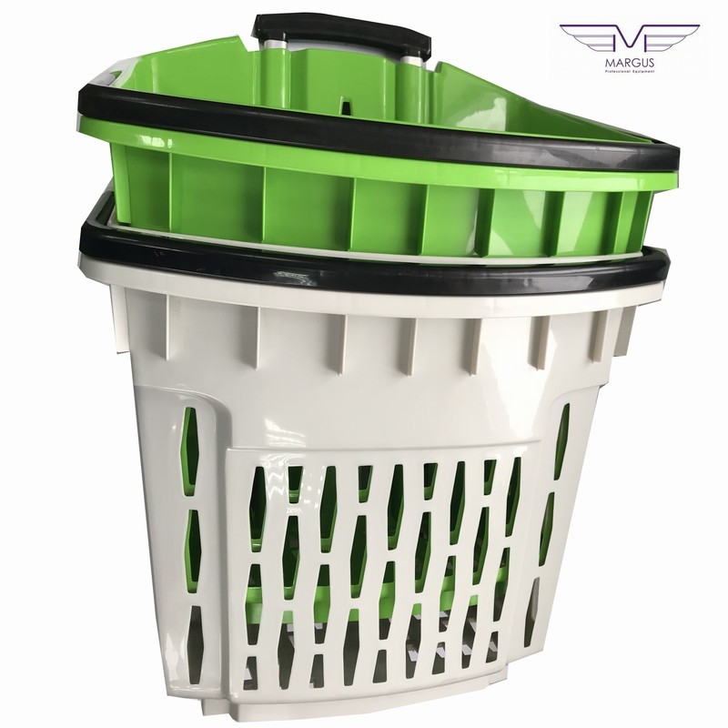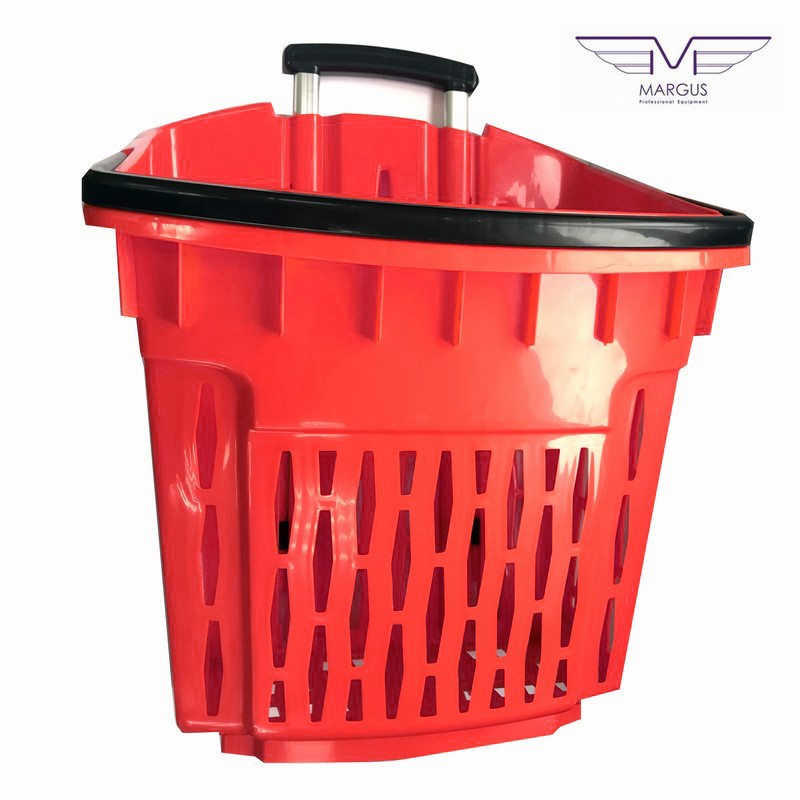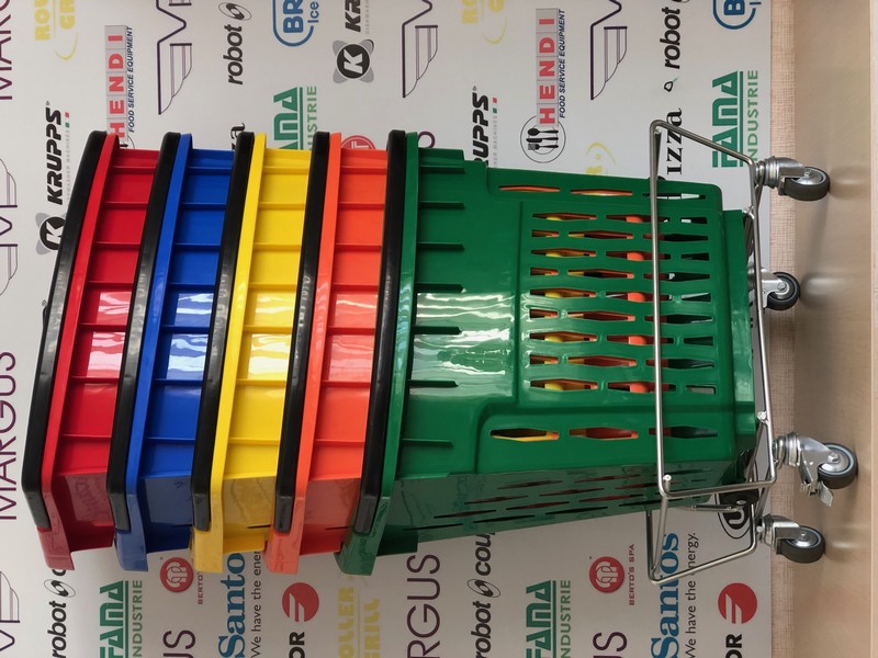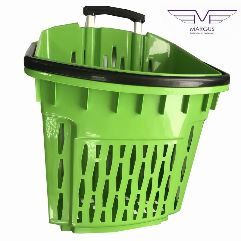Пластикова корзина на колесах має високу якість і естетику. Кошик для покупця на коліщатках доступна до замовлення в наступних кольорах: червоний, синій, жовтий, зелений (на вимогу можливістю виробництва в кожному кольорі палітри кольорів RAL). Кошик з пластику з колесами має 2 ручки, пофарбованих в стандартний чорний колір. Для кошика на колесах із пластику є можливість замовлення ручки в будь-який колір. Алюмінієві профілі в кошику із пластику для покупців відповідно до EN 755-9 DIN. Матеріал пластикової кошики антистатичний, схвалений для контакту з їжею. Пластикова корзина на колесах має гарну ударною міцністю і жорсткістю. Ганантійних термін - 12 місячний період (гарантія не поширюється на механічні пошкодження).